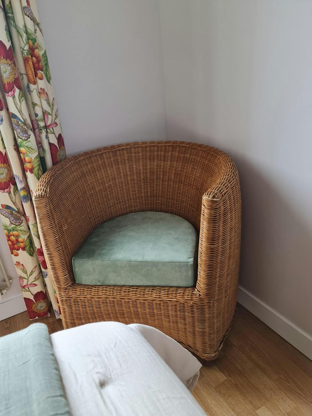 J ai chiné un fauteuil en rotin pour aller dans ma chambre refaite et relookée.